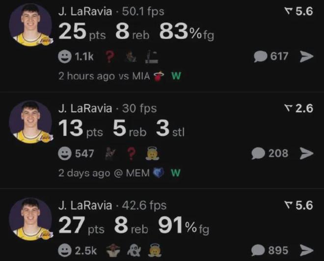 拉拉维亚在湖人三连胜期间,分别轰下27分8板2助1断、13分5板2助3断,以及25分8板3助4断,场均数据为21.7分7板2.3助2.7断,两项命中率78.1%和66.7%,真实命中率高达87.2%。